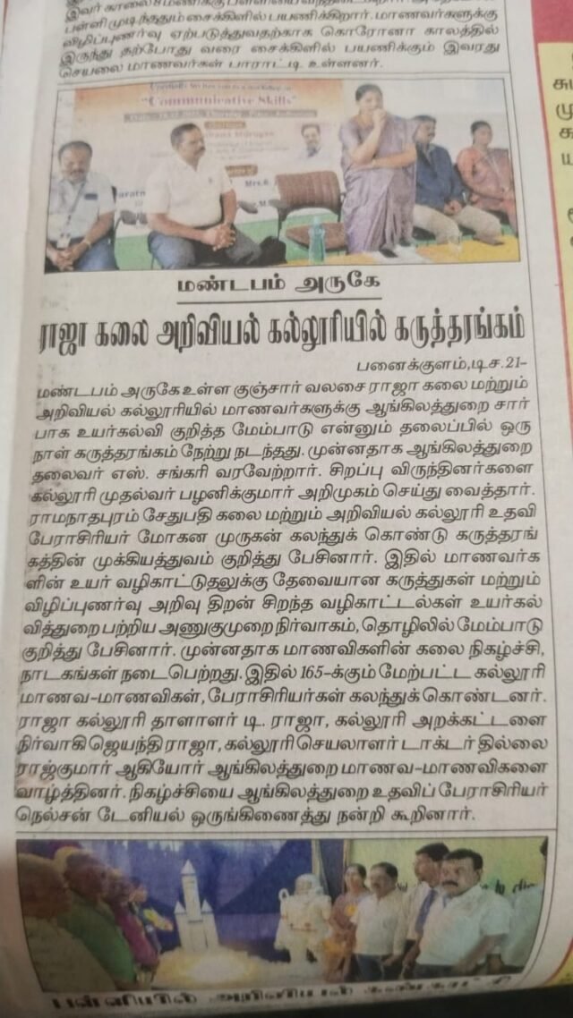 Our College Celebrated "The National Librarian Day” on today 12.08.2025. III BBA student Sindhuja delivered the welcome address. The inaugural address was delivered by Mr. A. Ramalingam Librarian. The program was presided over by Dr. T. Raja, Chairman, along with Mrs. Jayanthi Raja, Trustee, Dr. R. Thillai Rajkumar, Secretary, and Dr. M. B. Palanikumar, Principal. The special guest, Mr.S. Paulraj, Librarian, Syed Hameedha Arts college, Kilakarai. The event was well-coordinated under the leadership of the Librarian with the support of Assistant Professors. The program was hosted by Kavya, III BBA student, who did an excellent job as the master of ceremonies. Students actively participated with enthusiasm. Vote of thanks by Mohamed Asmiya, II BBA student.
