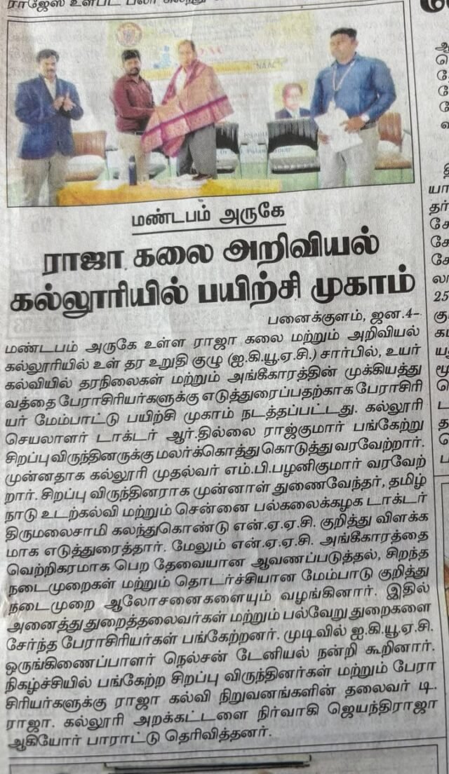 The Internal Quality Assurance Cell (IQAC) of Raja College of Arts and Science organized a Faculty Development Programme (FDP) on "NAAC". Dr. R. Thillai Rajkumar, Secretary, welcomed the Chief Guest, Dr. Thirumalaisamy, by presenting a bouquet. The welcome Address was delivered by Dr. M. B. Palanikumar, Principal, Dr. R. Thirumalaisamy, Former Vice-Chancellor, Tamil Nadu Physical Education and Sports University, Chennai, delivered an informative and inspiring session on NAAC. Head of all departments and Faculty members from various departments actively participated in the programme. The session was interactive, and participants gained a better understanding of quality assurance and accreditation procedures. The Vote of Thanks was delivered by Dr. R. D. Nelson Daniel coordinator IQAC.
